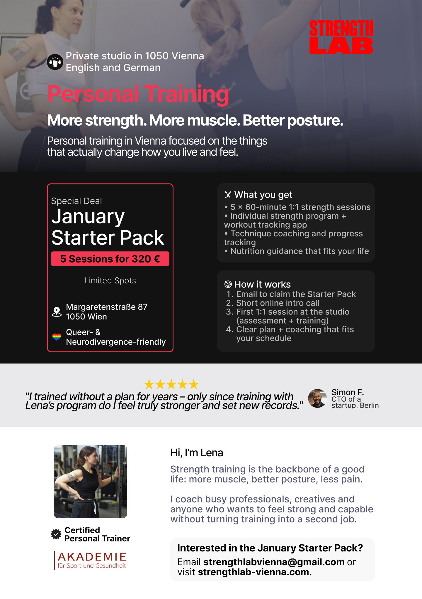 Your first paid 1:1 session at the studio in 1050 Vienna. We assess your movement, strength and posture and test key exercises.